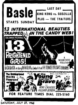 His film “13 Frightened Girls,” which played the Basle Theater on a double-bill with “The Young and the Brave” on Sunday, July 28, 1963, had a different kind of hook, however. Castle publicized a worldwide search for the 13 most beautiful women from 13 different countries. He even went as far as to make different edits for each country that highlighted their specific beauty. However, in true carnival-huckster form, not all of the girls were from the countries they represented.