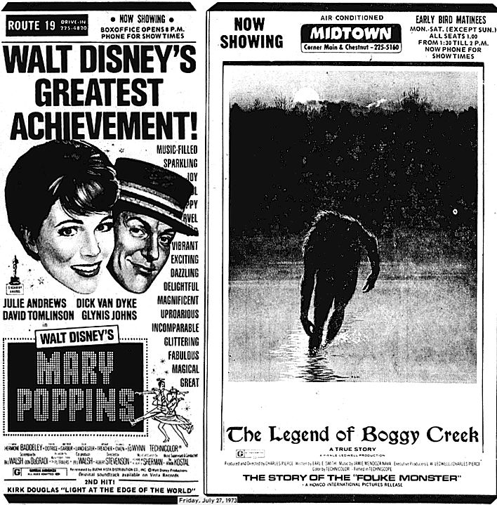 Oddly, it was Disney’s “Mary Poppins” playing the drive-in this past weekend in 1973. Any drive-in movie buff could tell you that those bookings definitely should have been reversed, because “The Legend of Boggy Creek” is a movie that would play best at the drive-in.