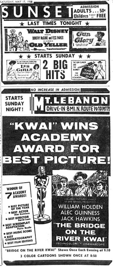 The Mt. Lebanon Drive-In was advertising “The Bridge on the River Kwai” beginning on Sunday, May 18, 1958. This classic film swept the Academy Awards that year with wins for Best Picture, Best Actor for Alec Guiness, Best Director, Best Screenplay Adaptation, Best Music Score, Best Cinematography and Best Film Editing.