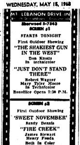 Ten years later in 1968, the Mt. Lebanon Drive-In was promoting “the first outdoor screening” of the Don Knotts western comedy “The Shakiest Gun in the West” backed with the Robert Wagner and Mary Tyler Moore comedy “Don’t Just Stand There!”