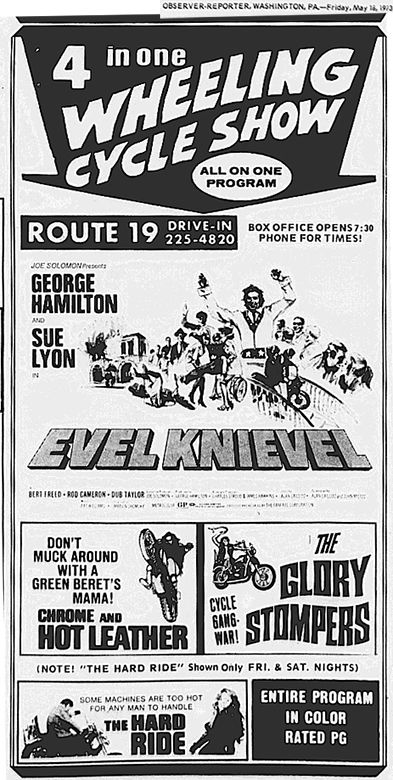 Route 19 Drive-In was billing a quadruple-feature “wheeling cycle show” with all motorcycle movies. Leading the pack was the biography of motorcycle daredevil “Evel Knievel” starring George Hamilton, followed by biker gang titles “Chrome and Hot Leather,” “The Glory Stompers” – starring a pre-“Easy Rider” Dennis Hopper – and “The Hard Ride.”