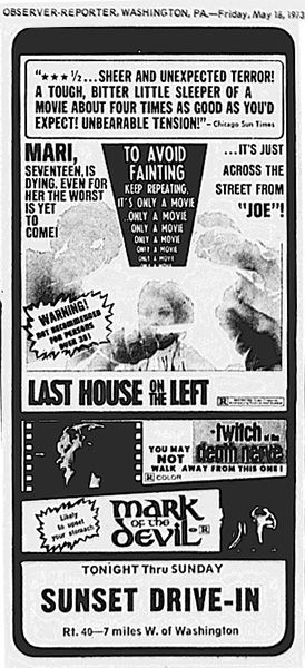 Along with “Last House,” Sunset was also showing Italian director Mario Bava’s “A Bay of Blood” under the title “Twitch of the Death Nerve” and the German horror film “Mark of the Devil” – which the ad warns is “likely to upset your stomach.”