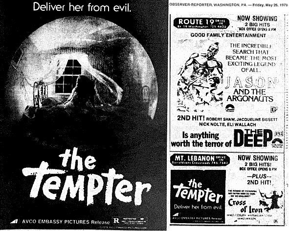 A bit further north, Mt. Lebanon Drive-In had quite a strange combination of titles with “The Tempter” – an Italian knockoff of “The Exorcist” that was also released under the title “The Antichrist” – and “Cross of Iron” – a WWII film from director Sam Peckinpah (“Straw Dogs,” “The Wild Bunch”).