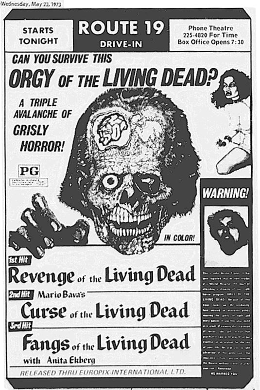 However, five years earlier in 1973, Route 19 was playing a “a triple avalanche of grisly horror” from Europe and advertised it with the risqué tagline, “Can you survive this orgy of the living dead?”