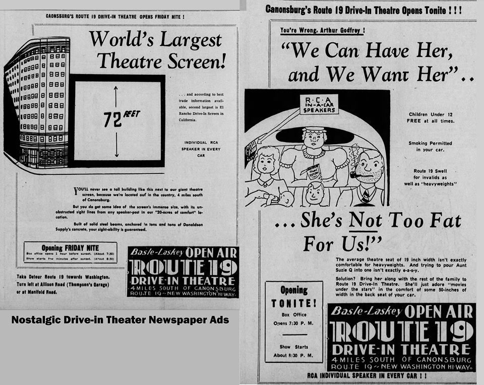 Another ad makes reference to Arthur Godfrey’s hit song “Too Fat Polka (She’s Too Fat For Me)” by showing a cartoon where a larger woman, named Aunt Suzie Q, could comfortably watch a movie in the backseat of the family car. The copy states that Route 19 was “swell for invalids as well as ‘heavyweights.'” That’s certainly one way to market a drive-in movie theater!