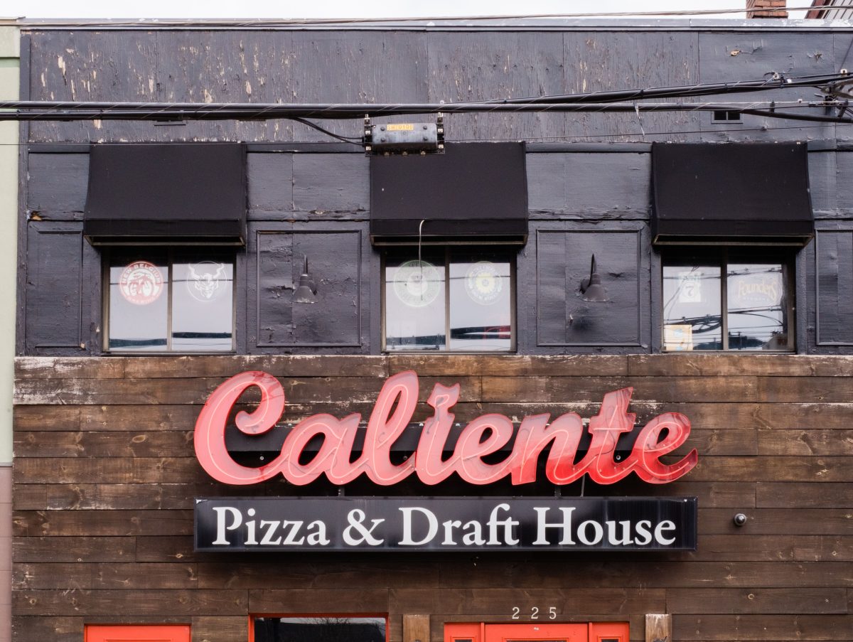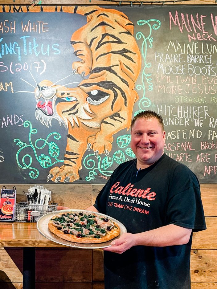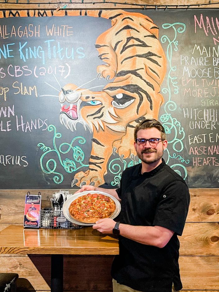 Caliente Pizza’s head regional chef Eric Von Hansen slides a silver tray decorated decadently in pizza covered with thinly sliced pork and brandied jam across a glossy wooden table inside the chain’s Aspinwall location.