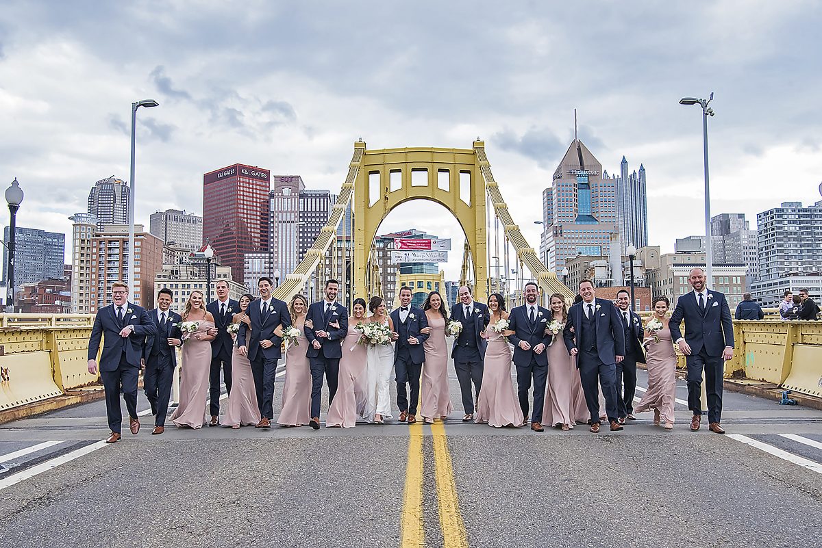 Laurel’s wedding gown was a sleeveless fit and flair style of lace and illusion with a plunging back and lace train by Mikaella Bridal from Bridal Beginnings in Mt. Lebanon. She topped it with a delicate cathedral length veil and carried a bouquet of roses with eucalyptus. Her nine bridesmaids wore dresses by Watters in blush and Laurel says Bridal Beginnings made getting them all fitted from around the country a simple process.